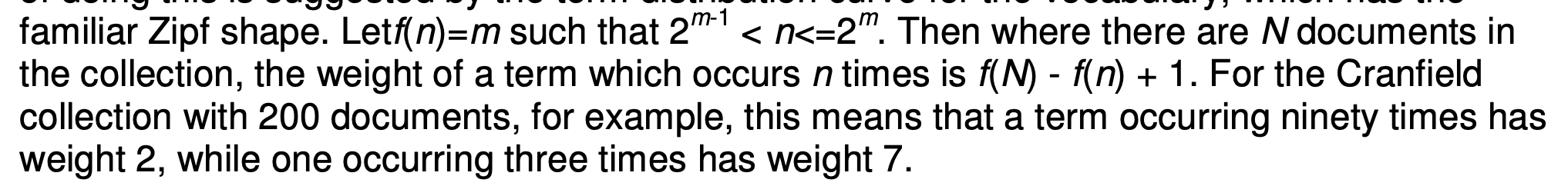 То есть вес термина = $f(N) − f(n) + 1$, где $N$ — число документов в коллекции, $n$ — число документов, содержащих термин, а $f$ — по сути округлённый логарифм по основанию 2: