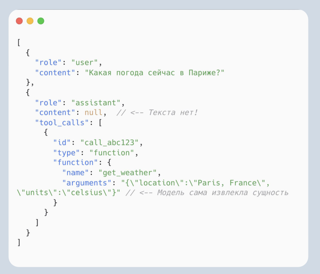 **Function calling** — когда модель вместо текста выдаёт структурированный вызов функции (обычно JSON) для выполнения действия.