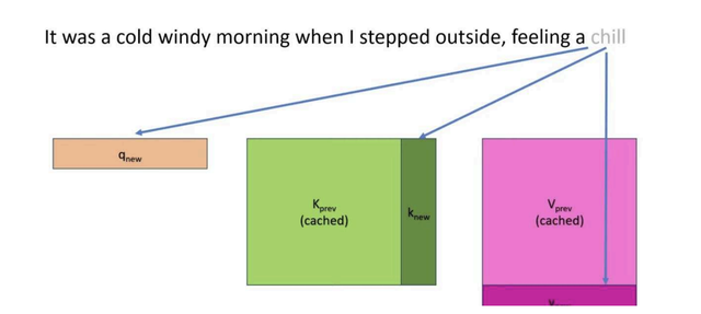Ключи $K$ и значения $V$ для прошлых токенов не меняются, поэтому их можно сохранить:
