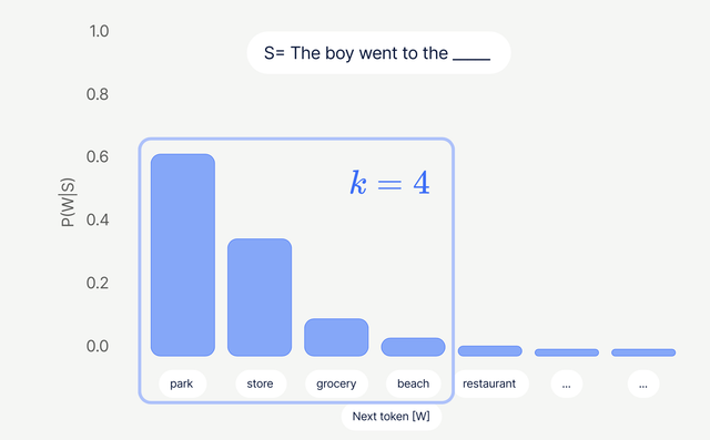 - **Top-k:** оставляем только $k$ наиболее вероятных токенов, остальные зануляем, затем сэмплируем.