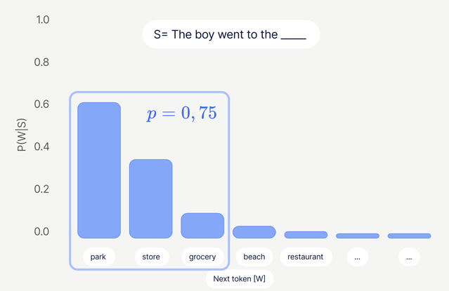 - **Top-p (nucleus):** оставляем минимальный набор токенов, чья суммарная вероятность $\geqslant p$ (например, 0.9–0.95). Адаптивно: при уверенной модели набор маленький, при «плоском» распределении — больше.